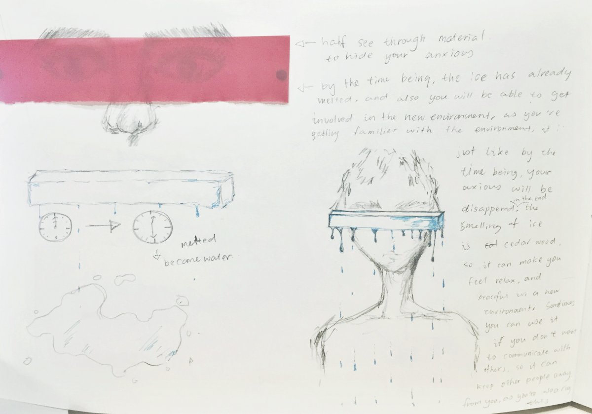 As i was inspired by the Naomi Filmer’s Ice worlk, smelling of wood and eyewear, so i decided to make something which can hide you anxiety, but also can be disappeared by the time being, just like the anxiety will disappear in the end as well. The image on the right indicates how my design looks like, So, to overcome the anxious in a new environment, you can wear this on your eyes, there are some features of this eyewear below: